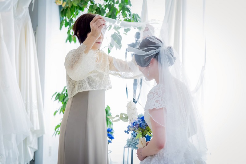 続いてご新婦様の入場シーン。お母様からベールダウンを。ベールには 古くからの言い伝えで、邪悪なものから花嫁を守る「魔除け」の願いが込められており、最後に花嫁の姿を整える感動のセレモニーです。