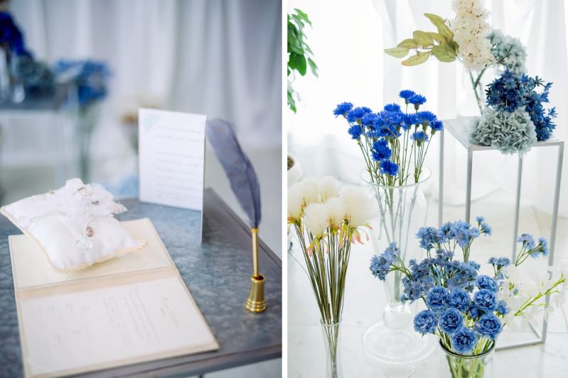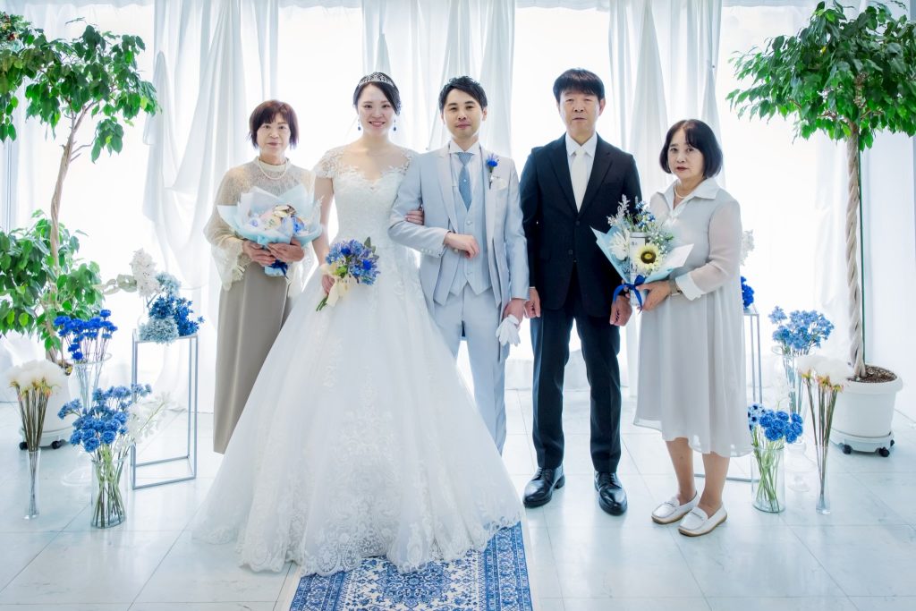 もともとは結婚式場で挙式を検討されていたおふたり。家族とアットホームに挙げられたらと、結婚式場に見学に行きましたが、最初のプランからどんどん予算があがってしまいおふたりのイメージと少し変わってきてしまったそう。予算をおさえてできないか悩んでいたところ、マリエブランシュを見つけてくださいました。おふたりのお話を伺うと、当初の予算内で挙式、そしてさらに和装の撮影もできるとのことで、とても喜んでいただけました。ウェディングプランナーと装花や挙式の進行・演出等お打合せを重ね、迎えた当日。ブルーをテーマに衣装・ブーケ・装花とトータルコーディネートしました。