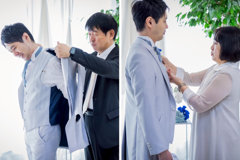 そして挙式がスタート。まずはご新郎様の入場です。ご新郎様の入場シーンでは、お父様にジャケットセレモニーを、お母様にブートニアセレモニーをおこなっていただきました。ご新郎様の最後の身支度を親御様の手で完成させ、挙式へと送りだす。ご新郎様にとっては自立と新たな人生のスタートを示す象徴的な瞬間であるともに、親御様にとっても“子育ての卒業”ともいえる感動的な瞬間です。
