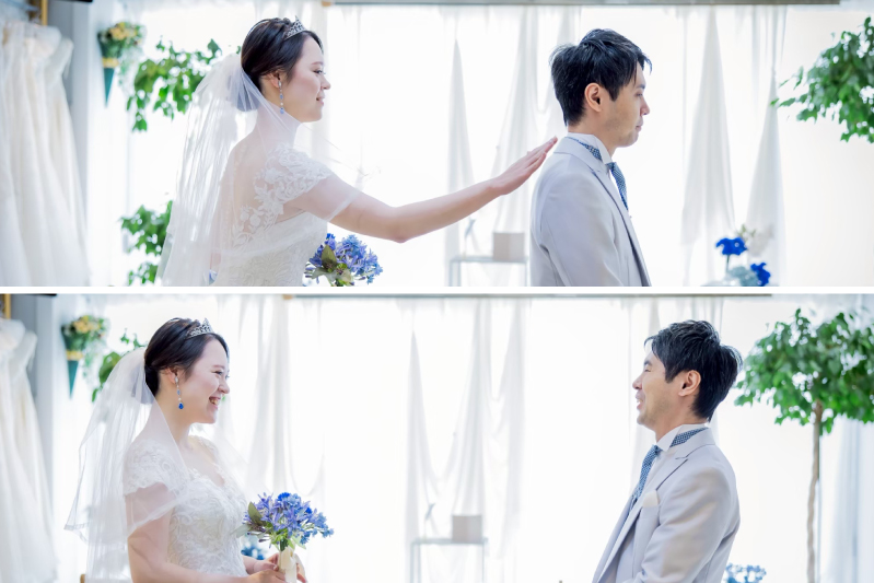 お支度が終わるとファーストミートへ。ウェディング姿のご新婦様をご新郎様に初お披露目です。