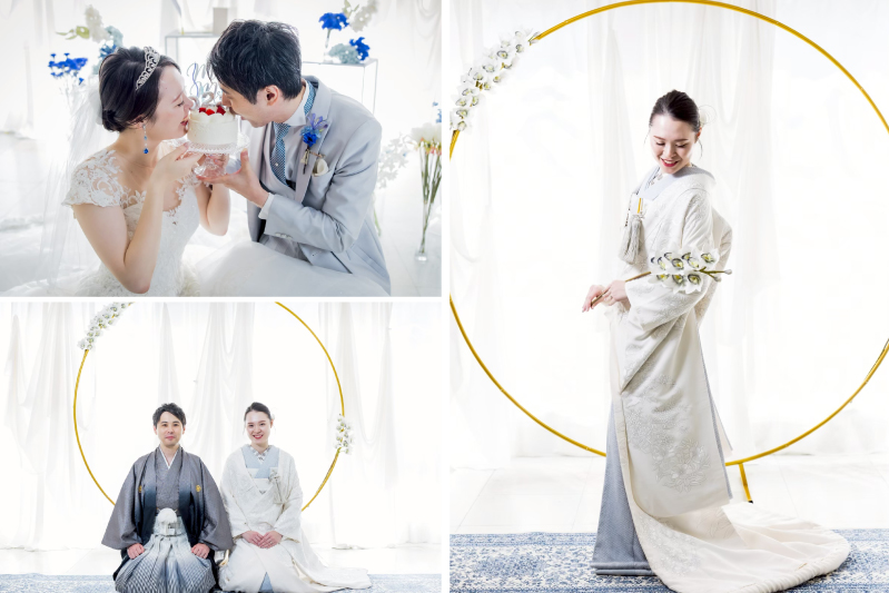 挙式のあとはスタジオ撮影!洋装、そして和装にもお着替え。白無垢×色掛下のブルーが可愛らしい装いは会場の装花とも相性バッチリ。